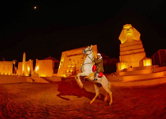 We will take you to the amazing Alf Leila Wa Leila Hurghada Show. You'll see an oriental show with colorful domes you've never seen before, be amazed by the enormous gates, towers, and high pillars, and learn more about the charming Egyptian fantasy. You can watch the Bedouin horse show, its fascinating dance, and many shows for Osiris and Isis. Finally, a guide will take you back to your Hurghada hotel.