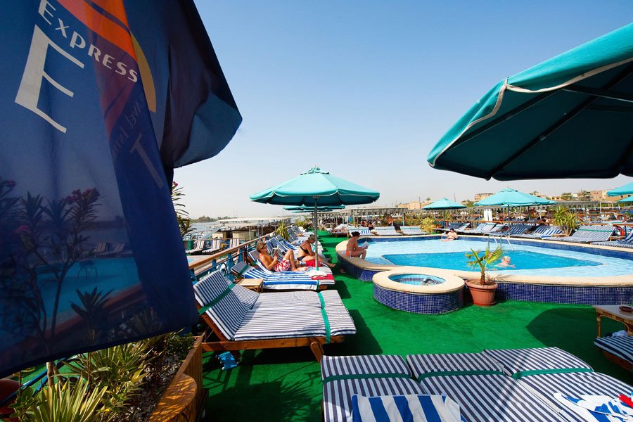 The Grand Rose Nile Cruise features many amenities that ensure a relaxing and enjoyable stay. The top deck, perfect for taking in the breathtaking views, is a popular spot for guests to relax, enjoy the sun, or sip on refreshing drinks. The cruise also boasts a swimming pool for those looking to cool off and unwind after a day of sightseeing.
