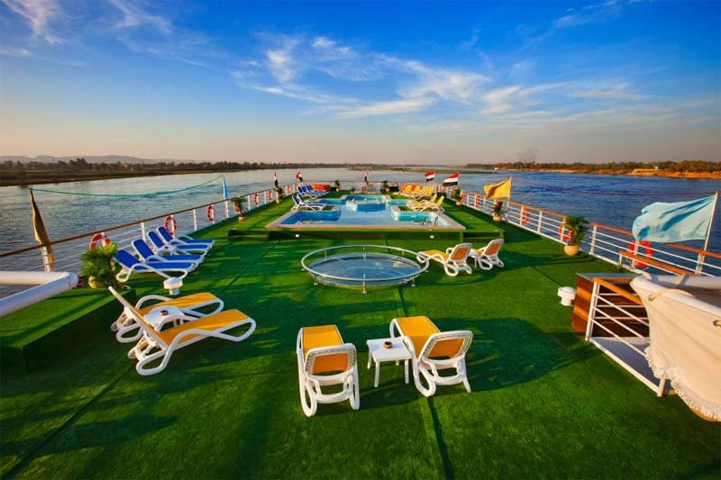 When it comes to relaxation, the Nile Quest delivers. The ship boasts a sun deck complete with comfortable loungers, a swimming pool, and a bar serving refreshing drinks. Here, you can relax under the Egyptian sun and enjoy breathtaking views of the Nile’s lush green banks.