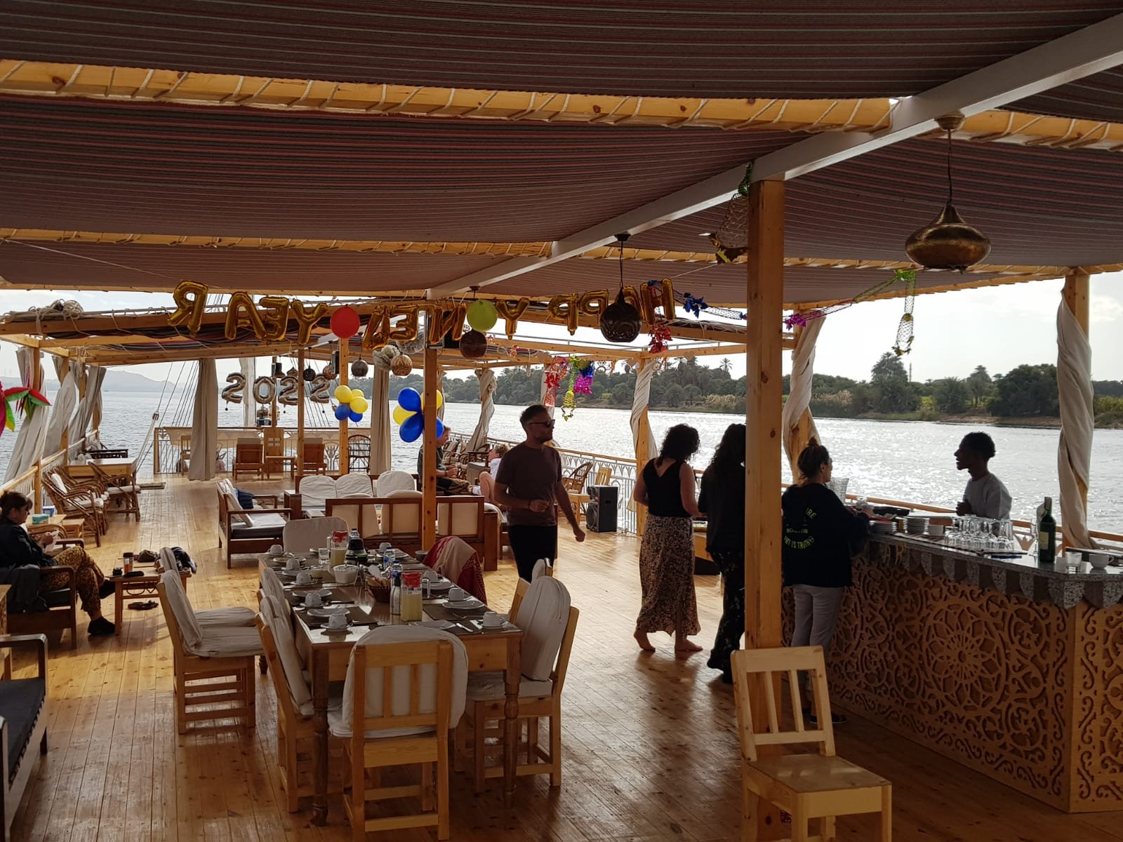 When we finally get close to the Speos of Hormheb, you're going to be shocked. If at all possible, dinner will be served on the lit-up temple grounds or on the top deck. During their meal, guests will be able to take in the peaceful atmosphere and listen to music that was chosen to fit the setting.