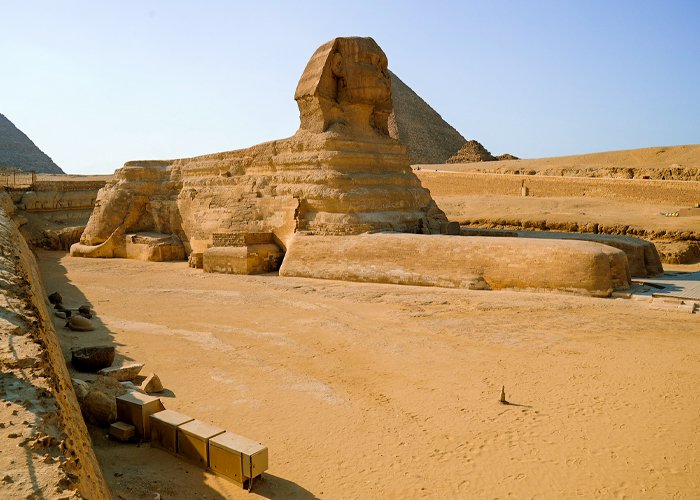 The Great Sphinx of Giza is the largest Egyptian statue. It was carved from the limestone of the Giza plateau and represents a recumbent lion with a human head and the so-called veil of a name. Originally, the Sphinx was painted red ocher and had a chin beard, but this fell into antiquity.